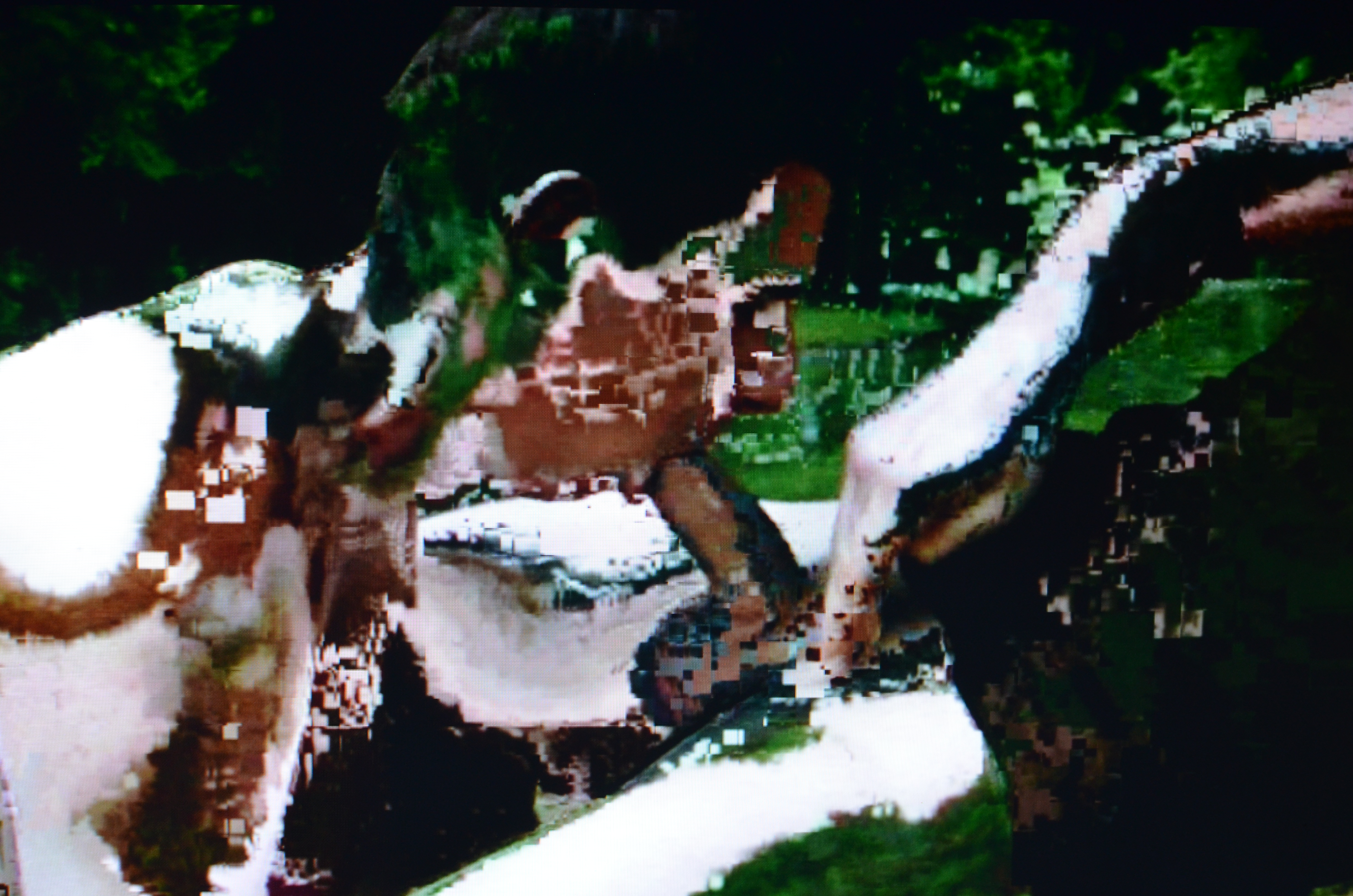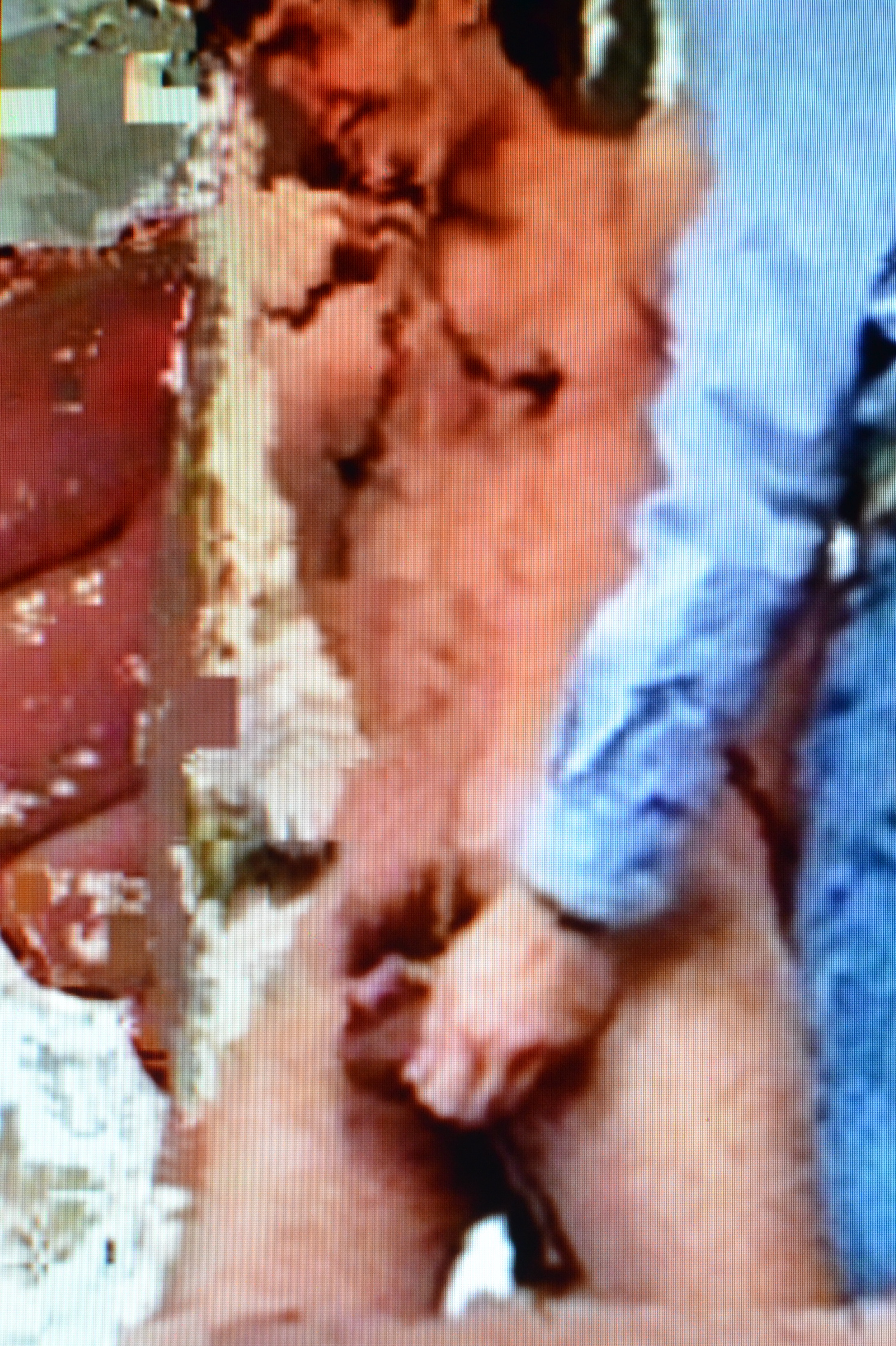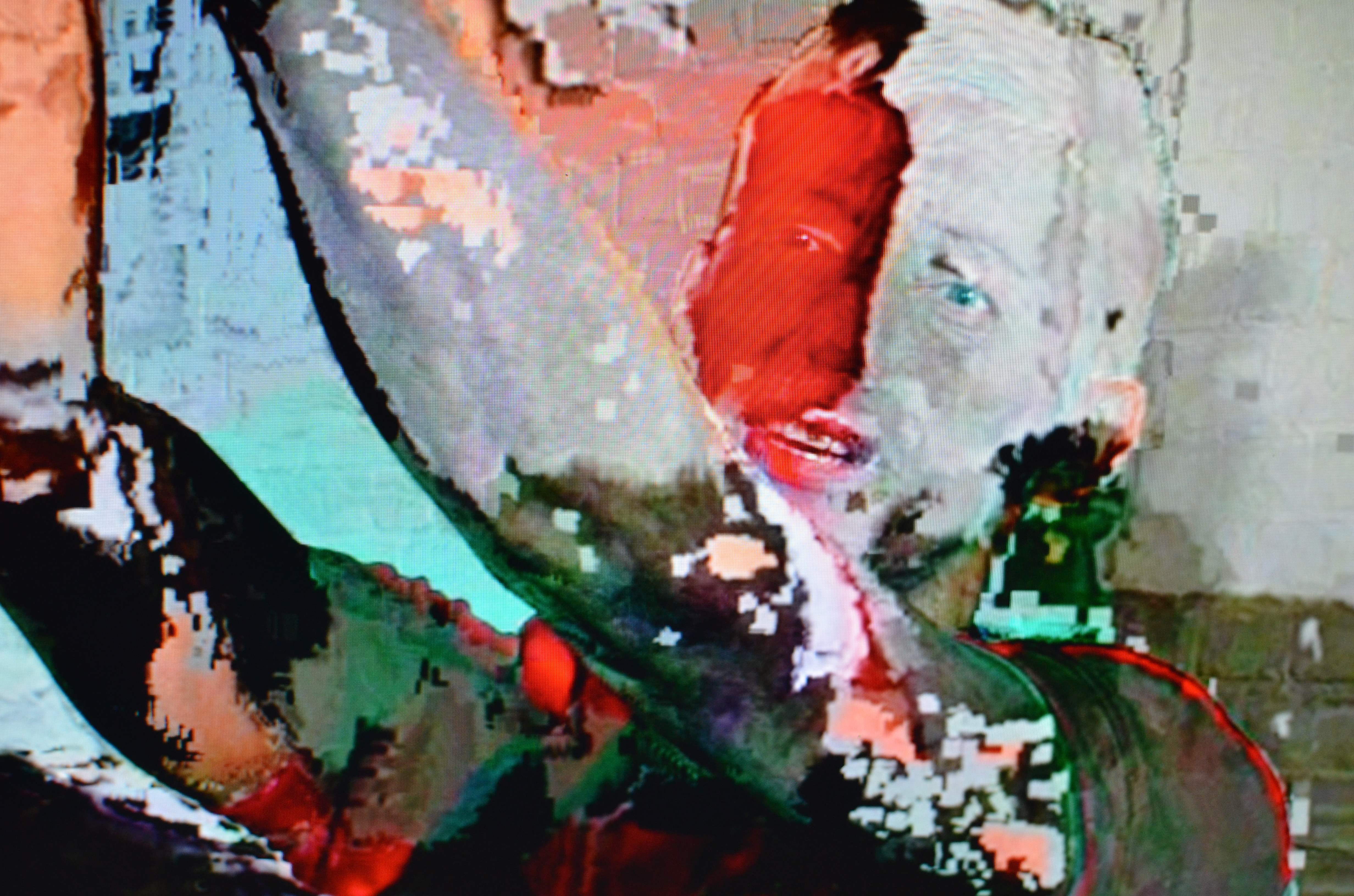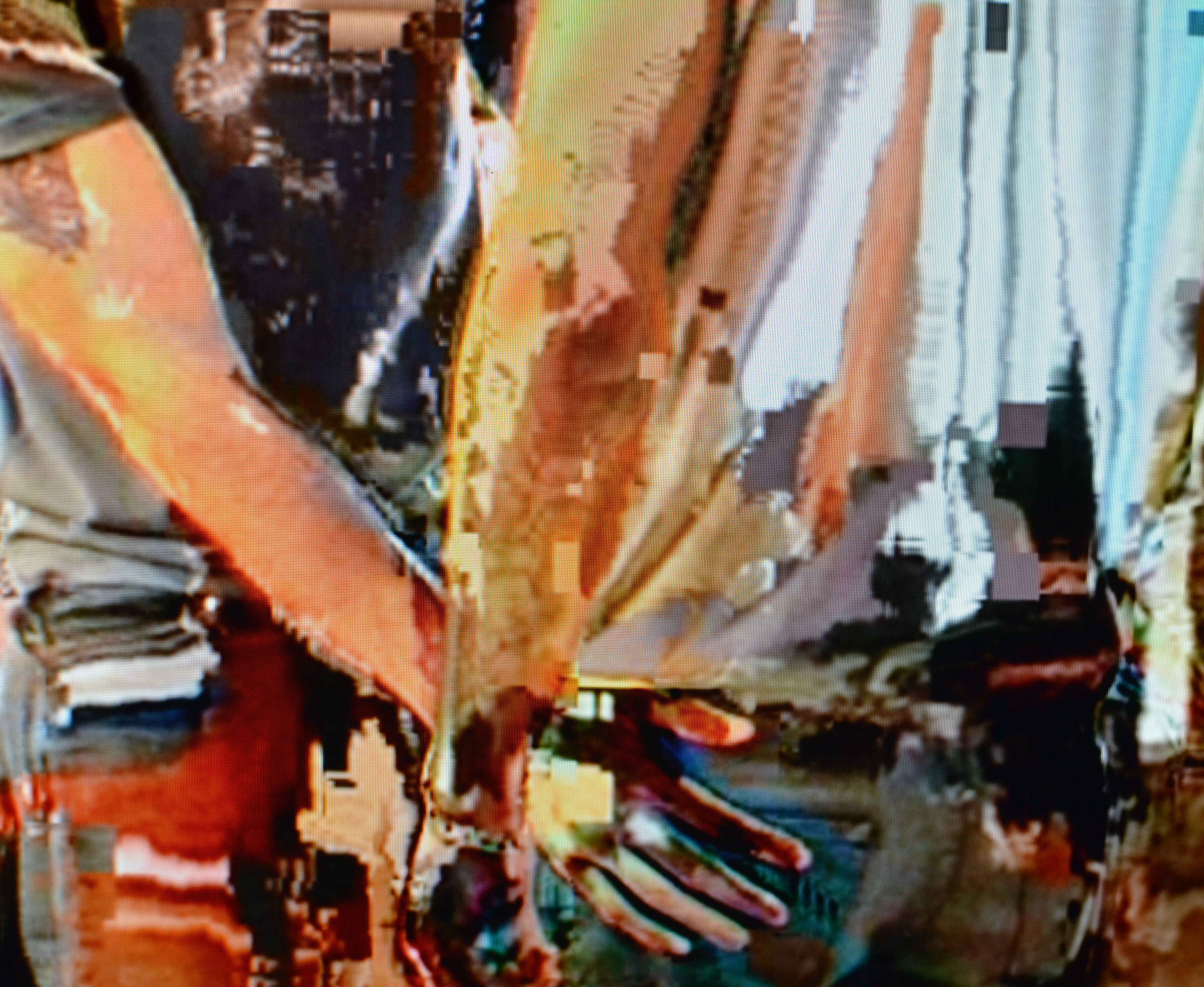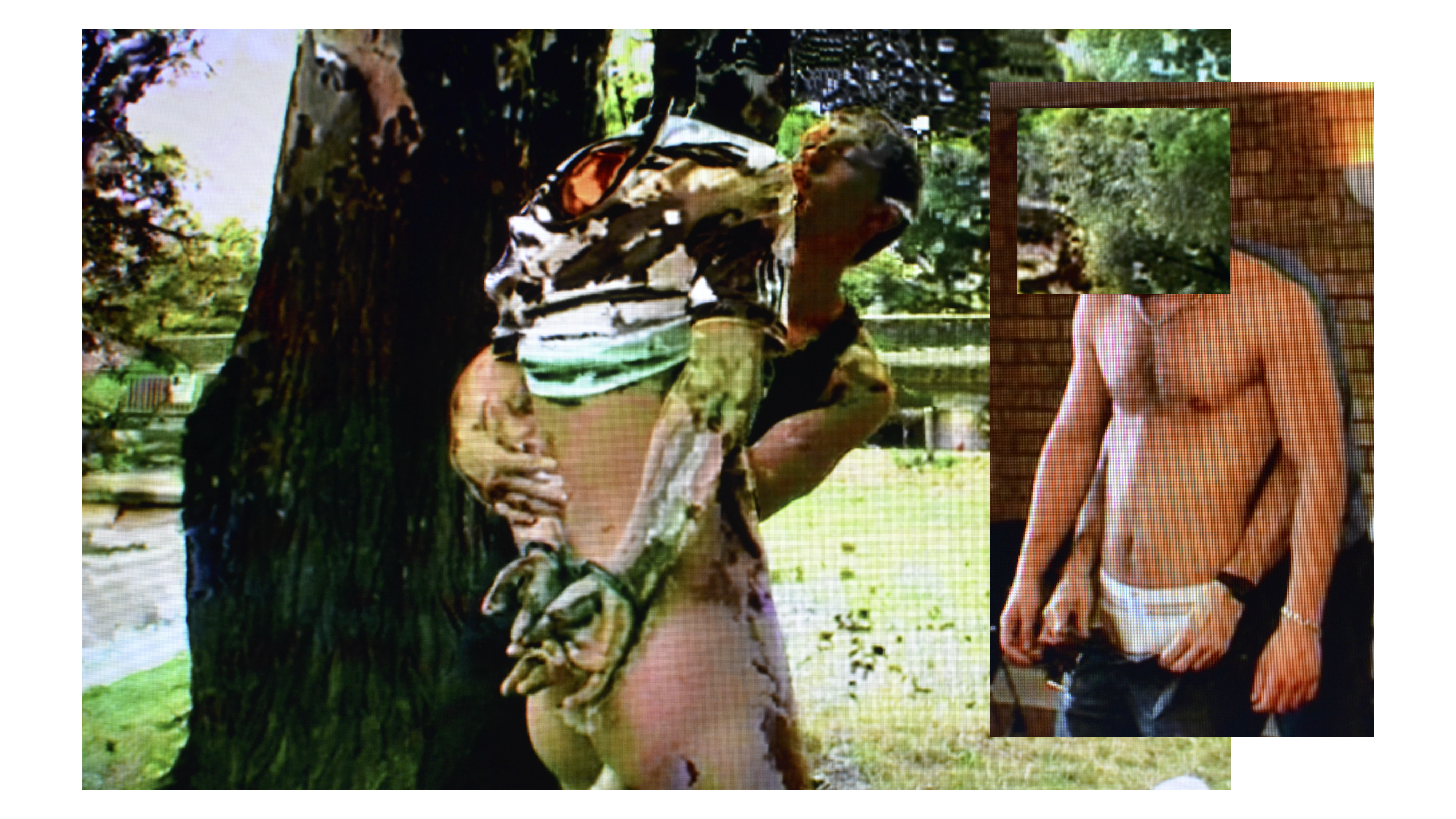 The images from the “Eating Too Fast” series are the product of quasi-random glitches applied to pornographic films. The merging of two individual frames’ pixels results in a third, a kind of dislocated mutant. Shots are encased into one another, penatrated in a disjointed blur of cocks, fists and ropes. These mechanically deconstructed anatomies lay bare the actors as fragmented ghosts.